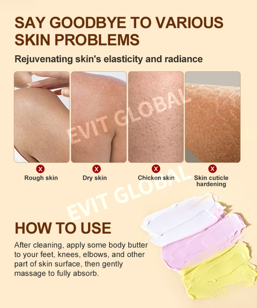 After cleaning, apply some body butter to your feet, knees, elbows, and other part of skin surface, then gently massage to absorb fully.